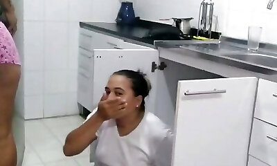 In a kitchen a sexy black-haired playing with her big bosoms